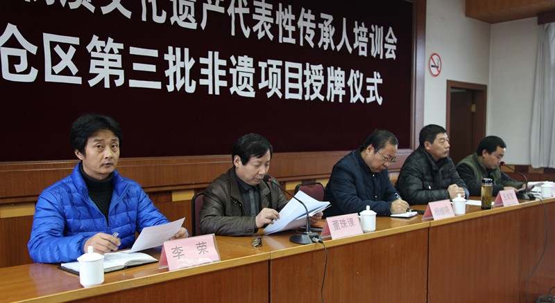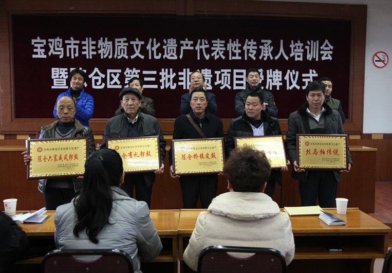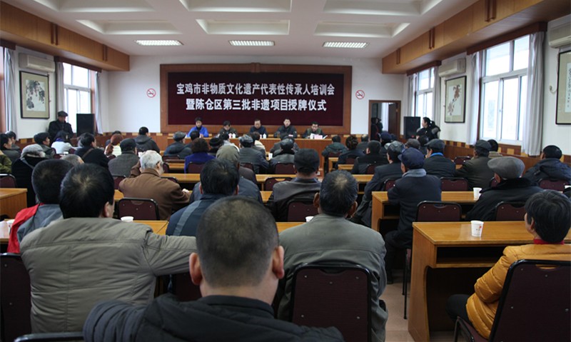市群众艺术馆副馆长、非遗保护中心副主任王斌智、区文化广电局局长杨继晓出席会议并讲话,区文化馆馆长董珠课主持会议仪式并安排2016年非物质文化遗产保护工作,区文化馆副馆长张宏昌出席会议宣读区政府《关于公布陈仓区第三批非物质文化遗产项目的通知》,区文化馆副馆长李