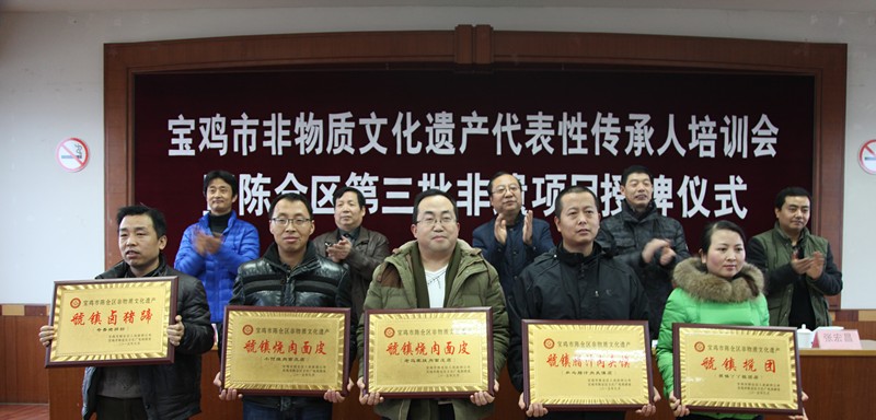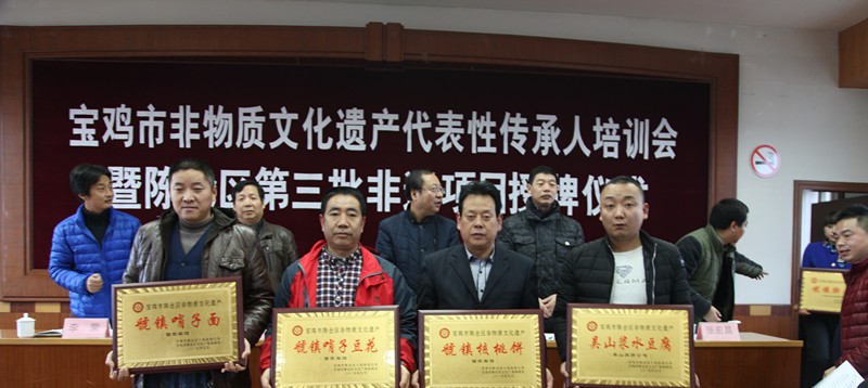 与会领导王斌智、杨继晓、董珠课、张宏昌、李荣向我区有礼锣鼓,六寨威风锣鼓,桥镇皮鼓,道教黄经,烈马柏民间传说,虢镇臊子面,虢镇臊子豆花,虢镇核桃饼,吴山浆水豆腐,虢镇擀面皮,虢镇烧肉面皮,虢镇腊汁肉夹馍,虢镇搅团,虢镇卤猪蹄第三批非物质文化遗产名录项目申报单位授牌并向我区非物质文化遗产保护研究中心捐赠非物质文化遗产实物的曹三信、杨朱贵、赵万科、罗锐彦、王惠玲等个人颁发收藏证书。